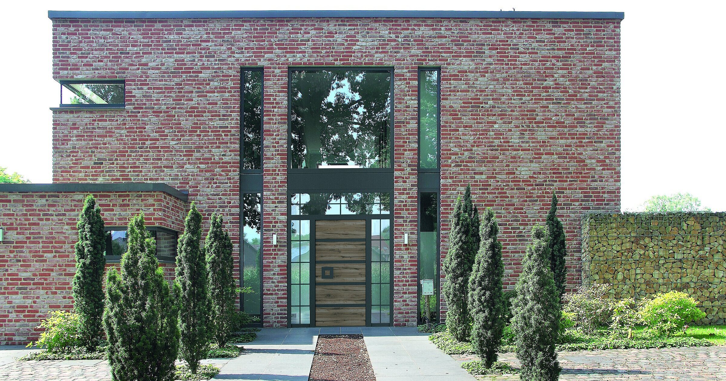 Eine Loft-Haustür ist zweifellos ein im Trend liegender und Look für moderne Häuser. Sie verleiht dem Eingangsbereich einen Hauch von Eleganz und Raffinesse und zieht sofort die Aufmerksamkeit auf sich. Der dunkle Farbton schafft einen starken Kontrast zu den umgebenden Wänden oder Fassaden und verleiht dem Gesamterscheinungsbild eine gewisse Dramatik. Schwarze Türen werden oft mit minimalistischem Design kombiniert, was ihrem modernen Look zusätzliches Flair verleiht.